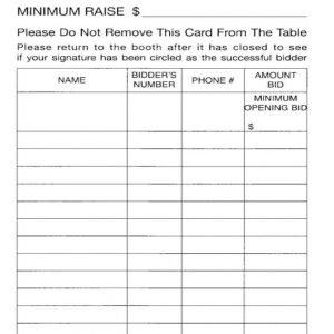 These large bid cards (8-1/2’ x 5-1/2’) are numbered front and back and have a white background with bold black numbers. They can easily slip into a registration packet, do not take up too much table space, yet are big enough to be seen in the back of a large banquet room. These are the most popular bid numbers available for charity auctions.